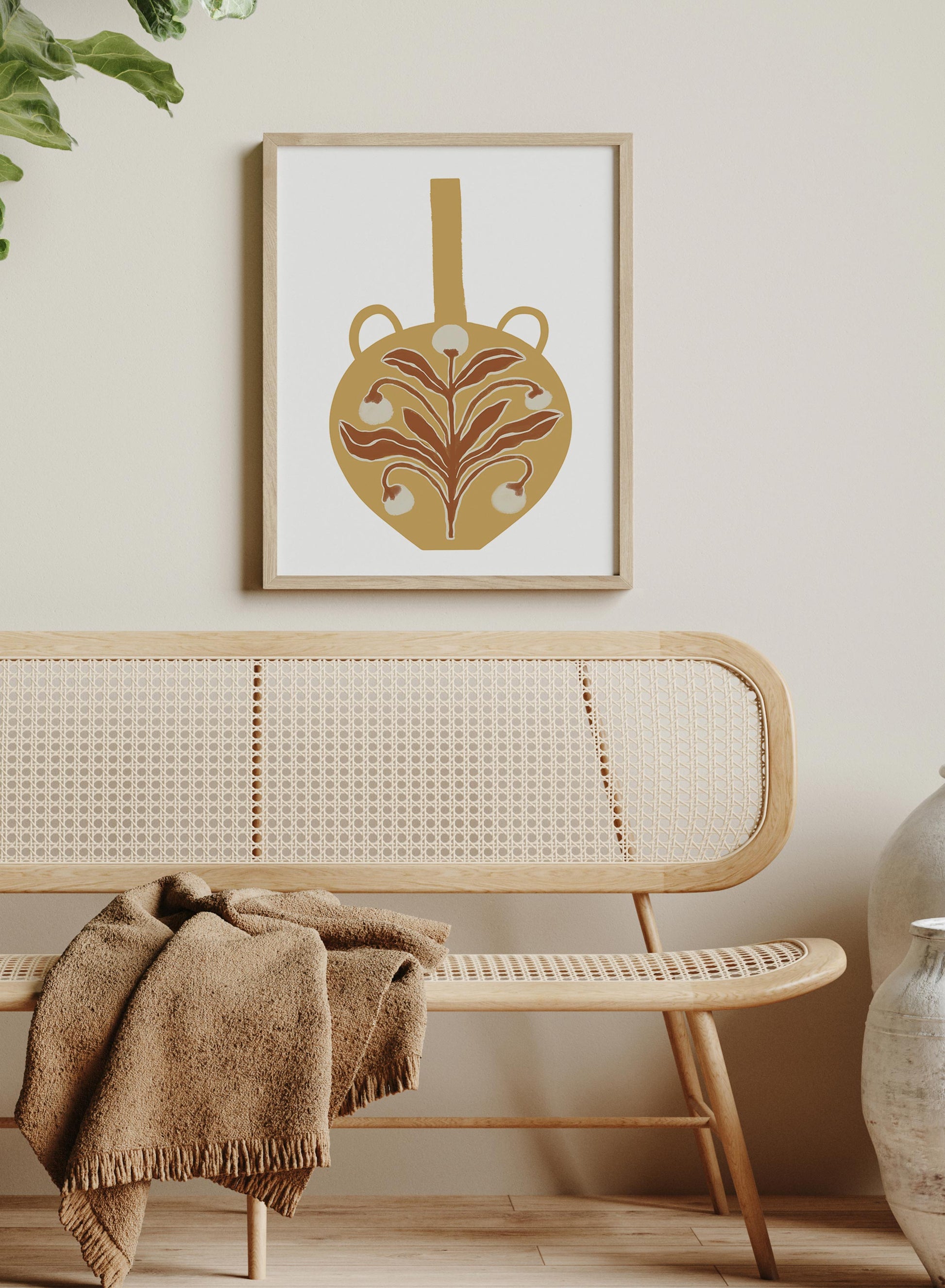Did you know that adding touches of yellow in your home can help boost creativity and overall happiness? The Melpomene art print is sure to brighten up your walls (and your days) with its beautiful yellow and burnt orange color palette. This floral poster features a rounded vase decorated with an abstract flower design with off-white and minimal flowers. Add this aesthetic flower print to your collection today.