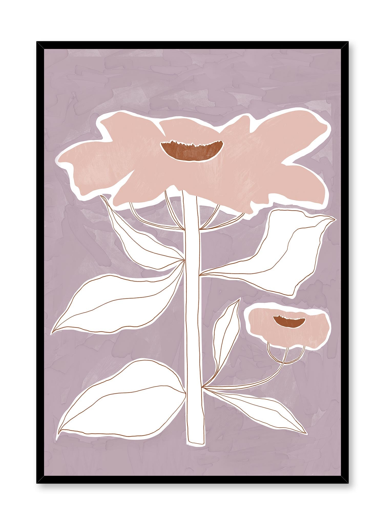 Talk about ‘Striking’! This flower poster deserves its spot on every decor lover’s wall. This art print features the outline of a white flower stem and leaves topped with large pink petals and an orange pistil over a light lilac purple watercolor background. With its gentle colors and rich texture, this bold flower illustration is sure to please all those who like the flower market aesthetic.